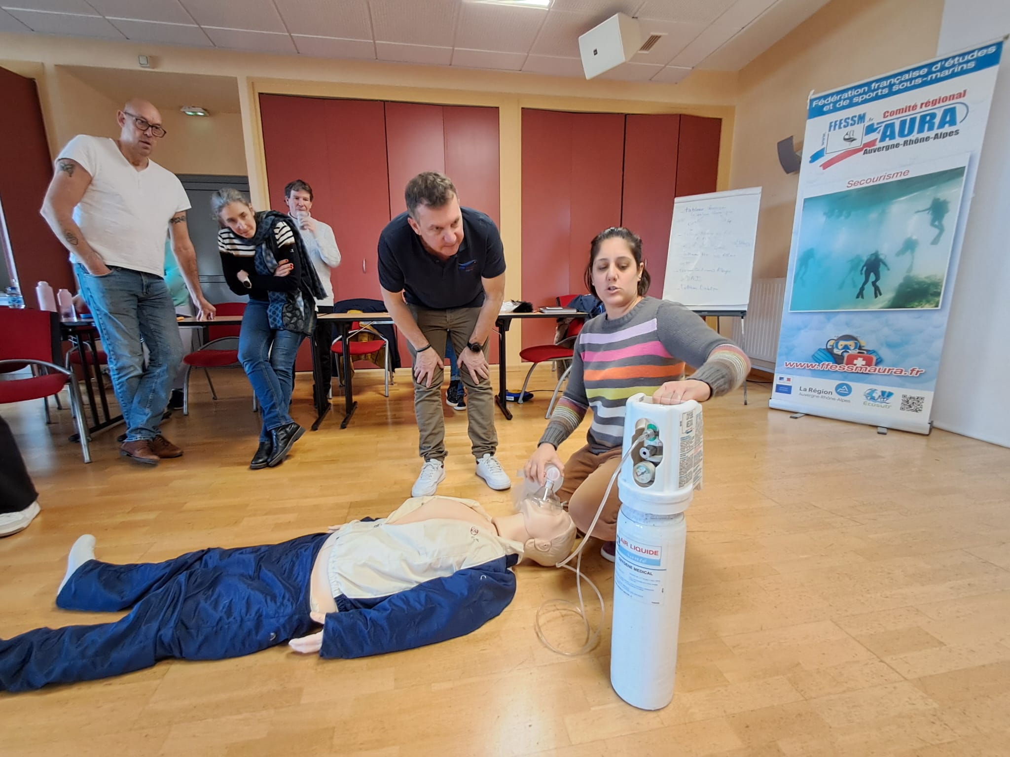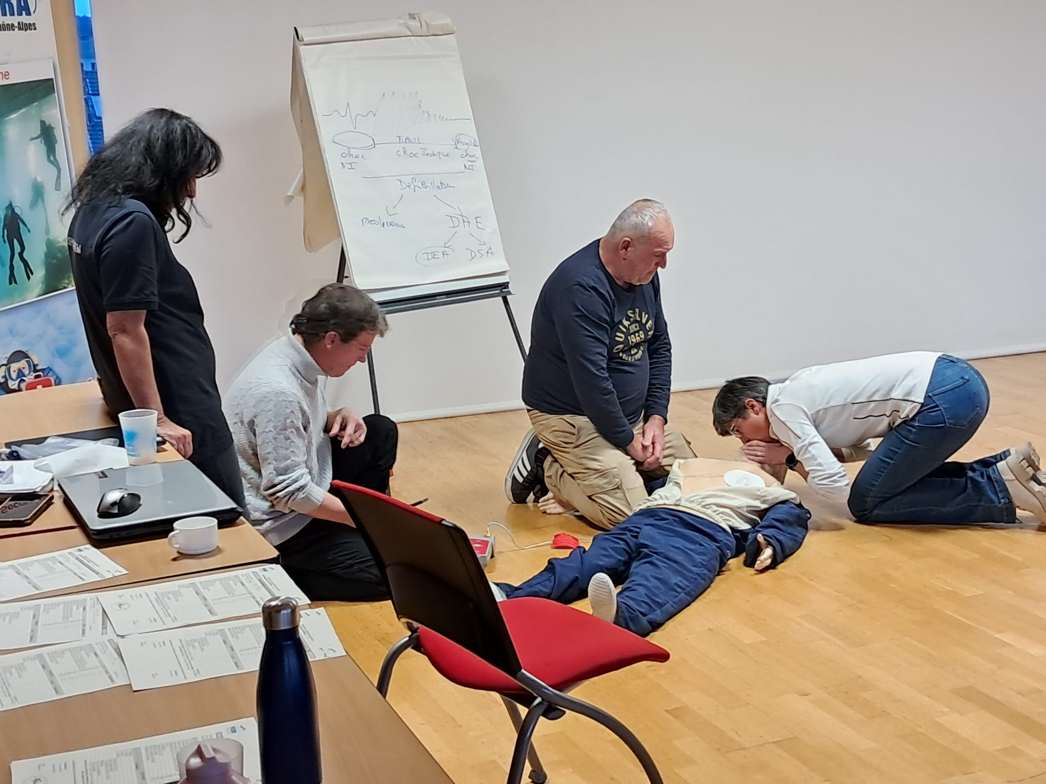 Comme habituellement sur la saison hivernale, la section Secourisme du CODEP01 organisait les 31 janvier et 1er Février 2026, une formation, cette année encore, à la Communauté de Commune de Chatillon Sur Chalaronne pour le PSC (Premier Secours Citoyen) et RIFAP (Réactions et Interventions Face à un Accident de Plongée) ainsi qu’ à la piscine Nauti-Dombes de Villars les Dombes pour la partie pratique du RIFAP.Depuis octobre 2021, le RIFA-P : « Réagir face à un malaise, à un inconscient qui ventile & à un Arrêt cardiaque » s’est étoffé de certaines compétences du PSC: « Réagir face à une hémorragie, une plaie, une brûlure et un traumatisme » ; néanmoins, d’autres telles que « utiliser un défibrillateur » et « secourir un plongeur qui s’étouffe » sont encore absentes de l’apprentissage de cette nouvelle mouture ce qui nous invite à l’associer au PSCet ce, depuis 2018 .