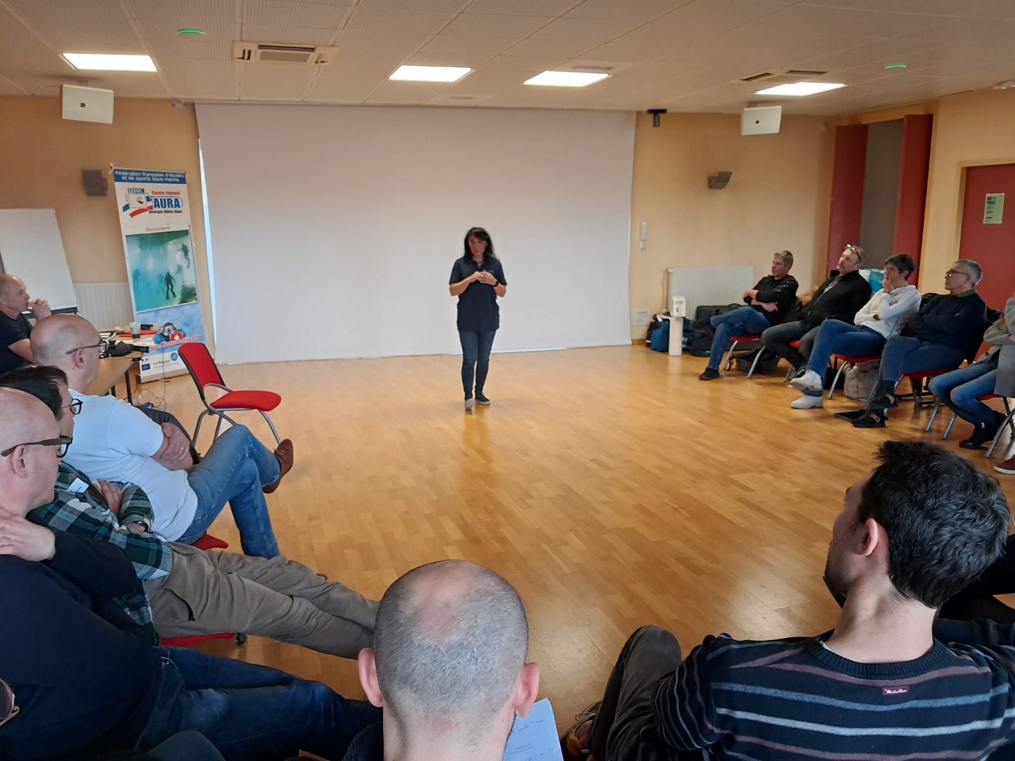 20 stagiaires de 11 clubs différents venant de l’Ain (6), du Rhône (4) et du Jura (1) ont ainsi bravé les distances , horaires matinaux et frimas hivernaux pour apprendre à secourir un plongeur accidenté.